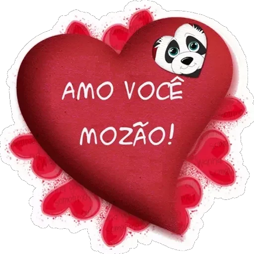 Un corazón rojo con el texto 'AMO VOCÊ MOZÃO!' y un dibujo de un panda en la esquina superior derecha, rodeado de pequeños corazones rojos.