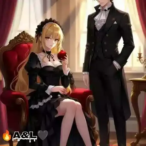 Una mujer rubia con vestido negro sentada en una butaca roja, sosteniendo una rosa roja, junto a un hombre de traje negro. El escenario es una habitación lujosa con cortinas rojas y una ventana al fondo.