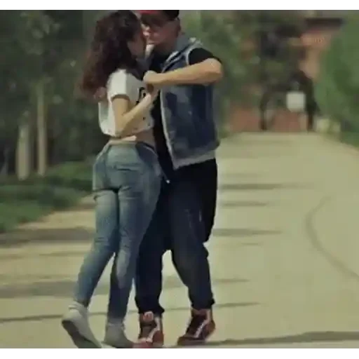 Una pareja besándose en una calle arbolada. La mujer tiene cabello castaño y viste una blusa blanca y jeans, mientras que el hombre viste una chaqueta de jeans y una gorra.