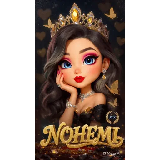 Una mujer de ojos azules y cabello castaño con una corona dorada, mano en el rostro y el nombre 'NOHEMI' en letras doradas.