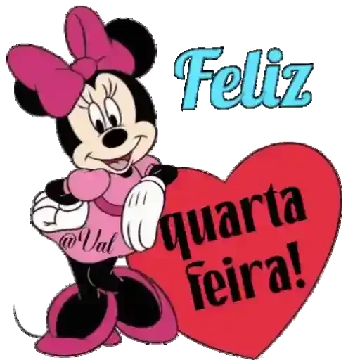 Minnnie Mouse vestida de rosa, con un lazo rosa en la cabeza, sonriendo y sosteniendo un corazón rojo con las palabras 'quarta feira!' escritas en negro. La palabra 'Feliz' está escrita en azul encima de ella.