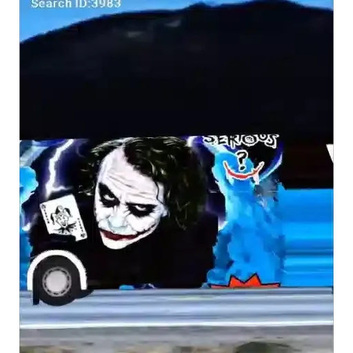 El Joker sonríe junto a un dibujo de un pájaro azul, con un coche al fondo. El Joker tiene maquillaje blanco en la cara y cabello negro.