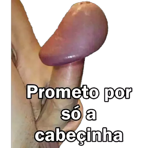 Mano sosteniendo un pene con la frase 'Prometo por só a cabeçinha' superpuesta.