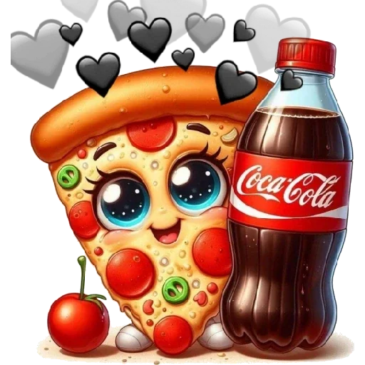 Una rebanada de pizza con ojos grandes y cara feliz, al lado de una botella de Coca-Cola y un tomate, con corazones grises y negros saliendo de su cabeza.