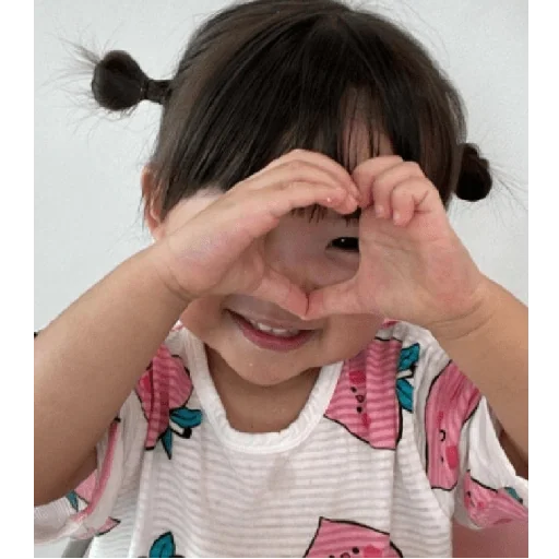 Niña con coletas haciendo un corazón con las manos delante de la cara. Ella está usando una camisa blanca con diseños de cerdo rosa.