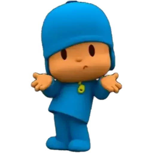 Um boneco de desenho animado com roupa azul e touca, com as mãos no rosto.