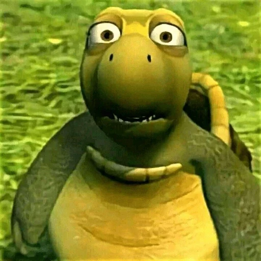 Tortuga con expresión de sorpresa, ojos muy abiertos y boca abierta, sobre un fondo de césped.