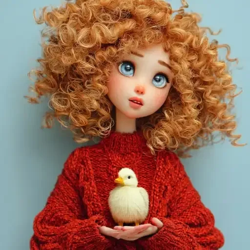 Niña con cabello rizado rojizo y ojos azules claros viste suéter rojo y sostiene un pato amarillo en su mano.