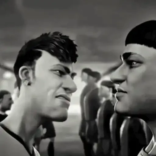 Dos hombres mirándose, expresiones serias, en blanco y negro.