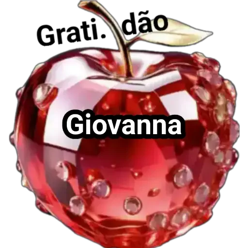 Una manzana roja brillante con una hoja dorada y gotas de agua. Texto superpuesto dice 'Grati. dão' y 'Giovanna'.