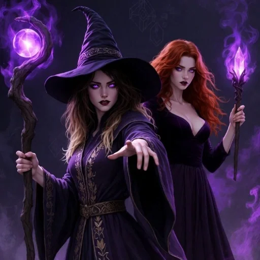 Dos brujas con varitas mágicas en llamas púrpuras, una con sombrero y capa oscura, la otra con cabello rojo y vestido negro.