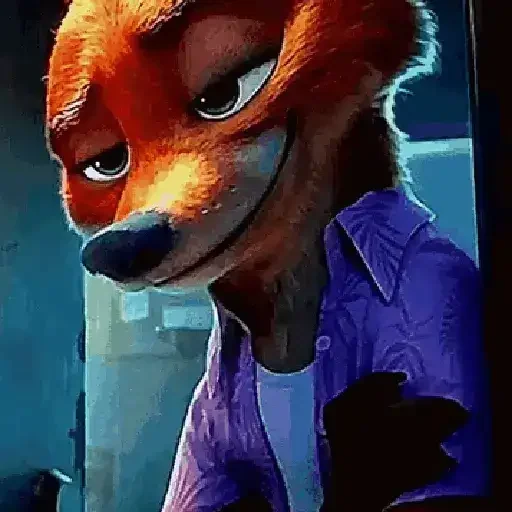 Personaje de dibujo animado con cabeza de zorro y cuerpo de humano, con camisa morada y mirada seria hacia abajo.