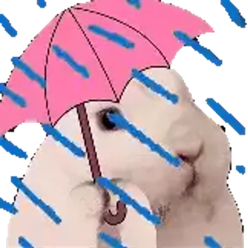 Un conejo blanco sosteniendo un paraguas rosa mientras llueve.