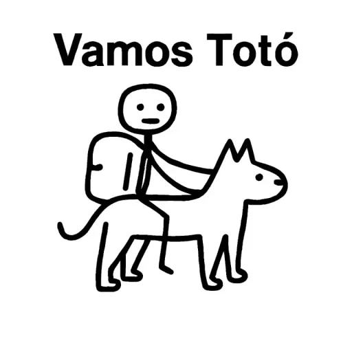 Un dibujo simple de una persona montada en un perro, con la frase 'Vamos Totó' arriba.