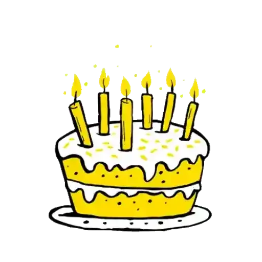 Un pastel de cumpleaños amarillo con velas encendidas y confeti blanco y amarillo.