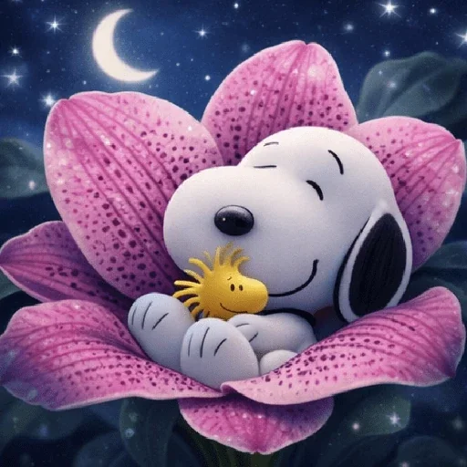 Snoopy y Woodstock durmiendo en una gran flor rosa bajo la luna creciente en el cielo nocturno.