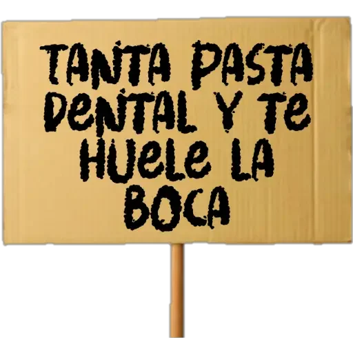 Señal de cartulina con texto 'TANTA PASTA DENTAL Y TE HUELE LA BOCA' en negro, pareciendo ser una crítica o ironía sobre la pasta de dientes.