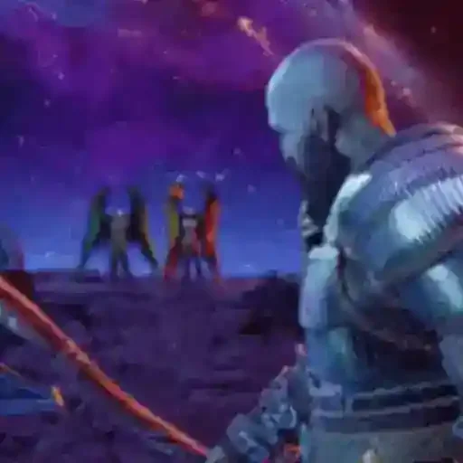 Personaje con armadura plateada y espada naranja frente a tres figuras en el fondo, en un escenario espacial nocturno.