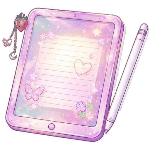 Una tableta rosa con un bolígrafo al lado, mostrando una página de notas decorada con corazones, mariposas y flores.