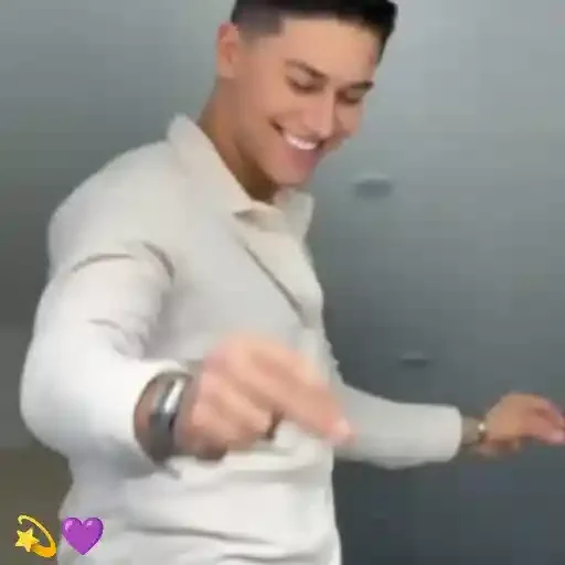 Un hombre sonriendo y bailando, con un abrigo blanco y un reloj, con un corazón morado y un emoji de dinero en la esquina inferior izquierda.
