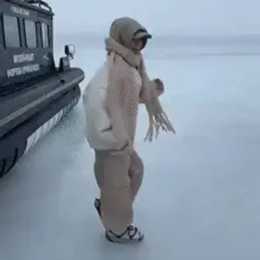 Mujer vestida de beige al lado de un barco en un entorno frío y nevado, con gafas y gorro.