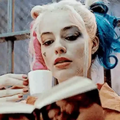 Harley Quinn, caracterizada con maquillaje blanco y rosa, mirando hacia un lado mientras sostiene una taza de café y un libro.