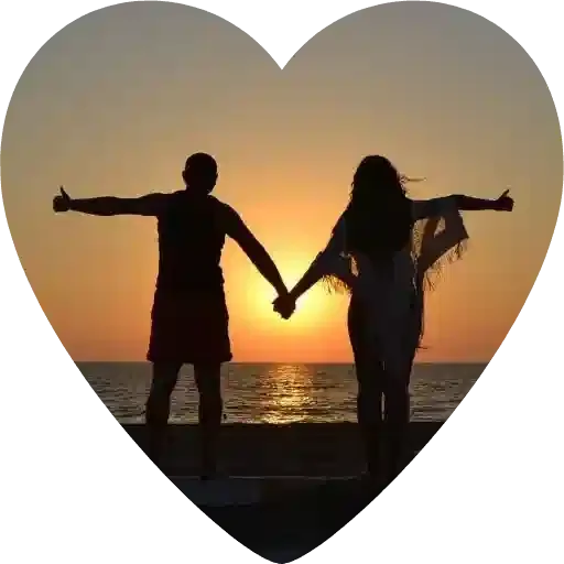 Una pareja de siluetas con los brazos abiertos y de manos dadas, frente a una puesta de sol en la playa, dentro de un corazón.