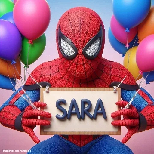 El hombre araña sostiene un letrero con el nombre 'SARA' y globos de colores en el fondo.