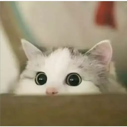 Um gatinho branco com olhos grandes e pretos, focados na câmera, com orelhas pointed e um focinho rosa, espiando de…