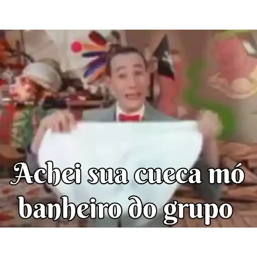 Un hombre con traje gris y corbata roja sostiene un papel en blanco con el texto 'Achei sua cueca mó banheiro do grupo' debajo.