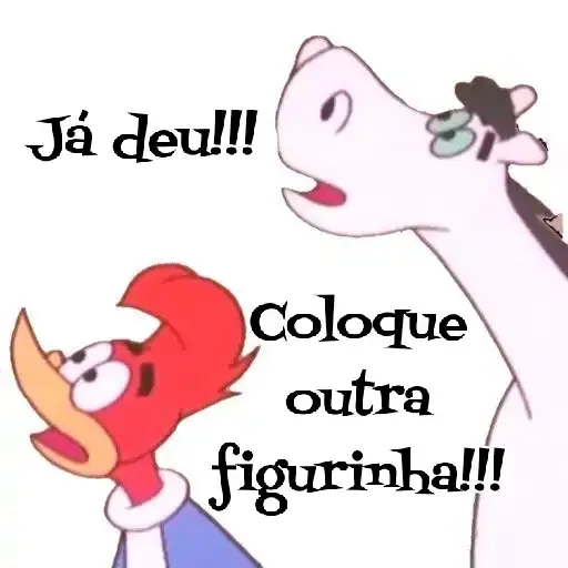 Dos personajes de dibujos animados, un gallo rojo y una jirafa blanca, con textos 'Já deu!!!' y 'Coloque outra figurinha!!!'