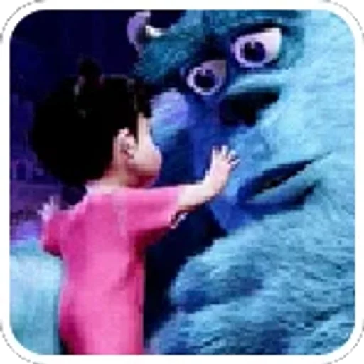 Una niña con cabello negro y vestido rosa tocando la cara de un monstruo azul peludo con ojos grandes y asustadores.