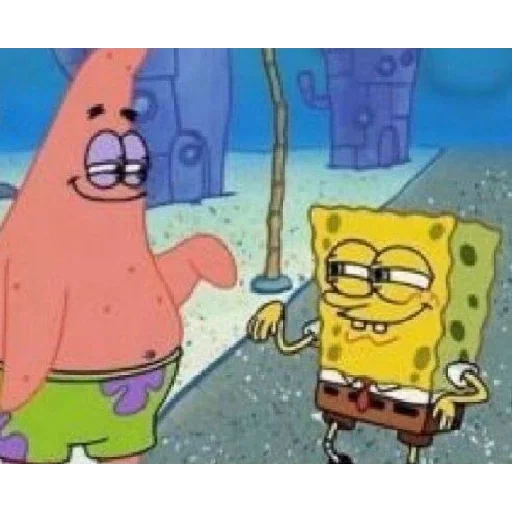 Patrick Star y Bob Esponja con gafas y expresiones divertidas en un escenario submarino.