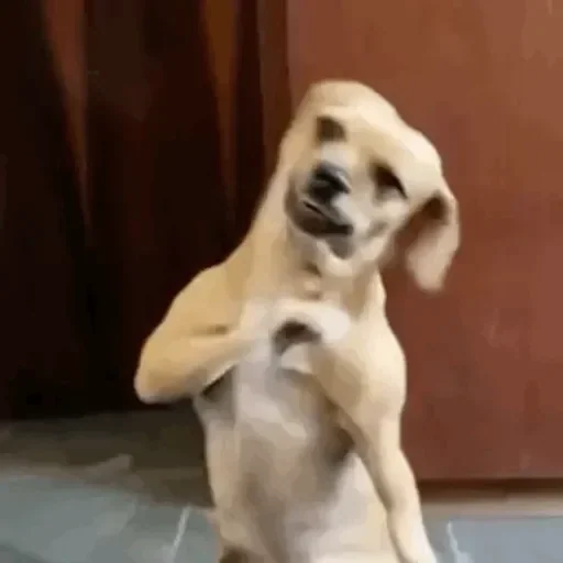 Un perro amarillo parado sobre sus patas traseras, con las patas delanteras levantadas y una expresión divertida en su cara.