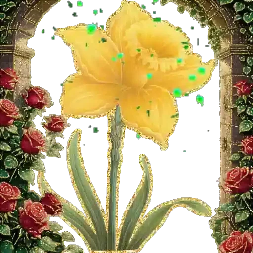 Una gran flor amarilla con hojas verdes, rodeada de rosas rojas y follaje, enmarcada por un arco de piedra.