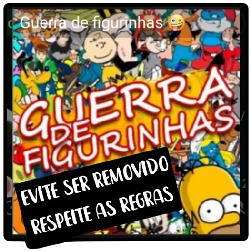 Una imagen colorida con varios personajes de dibujos animados, con el texto "GUERRA DE FIGURINHAS" destacado y "EVITE SER REMOVIDO RESPEITE AS REGRAS" en un rectángulo negro.