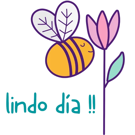 Una abeja amarilla sonriente con alas blancas vuela cerca de una flor rosa. Debajo, dice 'lindo dia !!' en verde.