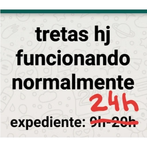 Texto en negro sobre fondo claro, con las palabras 'tretas hj funcionando normalmente' y 'expediente: 9h-20h' tachadas, con '24h' en rojo.