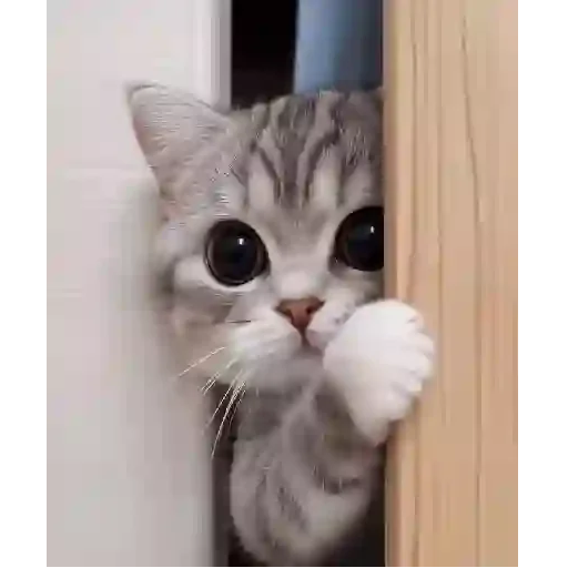 Um gatinho branco com olhos grandes e pretos, focados na câmera, com orelhas pointed e um focinho rosa, espiando de…