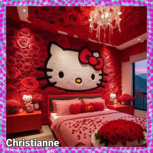 Quarto rosa com cama e decoração Hello Kitty, cortinas e luzes. Nome "Christianne" no canto.