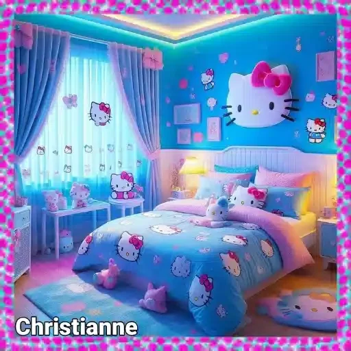 Quarto infantil com cama e decoração Hello Kitty, paredes e cortinas azuis, e um candelabro. O nome 'Christianne'…