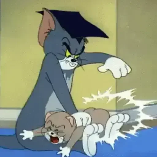 Tom, el gato gris, está enojado y señala a otro gato marrón que está en el suelo, con expresión de dolor y choque, y rayos saliendo de su cuerpo.