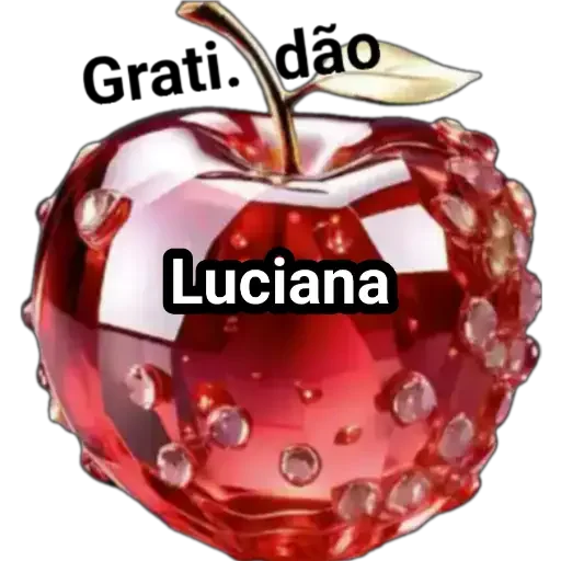 Una manzana roja brillante con gotas de agua, con el texto 'Grati. dão' en la parte superior y 'Luciana' en el centro.