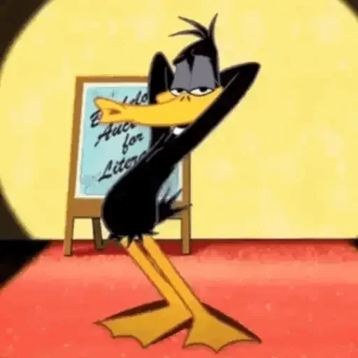 Un pato de dibujos animados con expresión enojada, haciendo un gesto con su ala, frente a una pizarra con texto parcialmente visible.