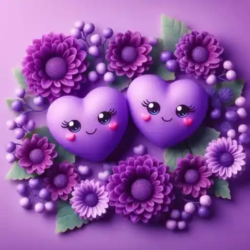 Dos corazones morados con caritas lindas, rodeados de flores moradas y hojas verdes.