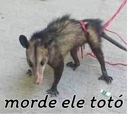 Un oposo con una correa rosa está mirando hacia abajo, con el texto 'morde ele toto' superpuesto.