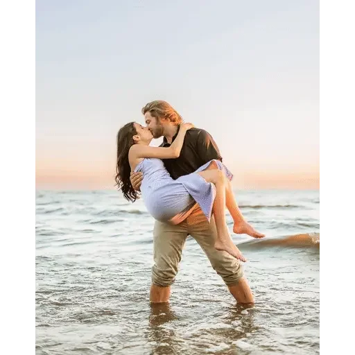 Una pareja se besa en la playa durante la puesta de sol. El hombre está de pie en el agua, con la mujer en brazos, vestida con un short blanco y él con una camiseta negra y pantalones beige.