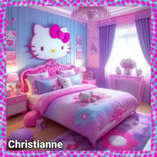 Quarto rosa com cama e decoração Hello Kitty, cortinas e luzes. Nome "Christianne" no canto.