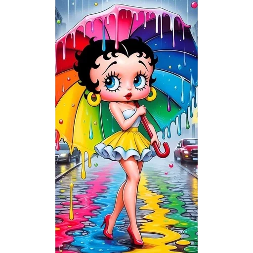 Betty Boop sosteniendo un paraguas colorido bajo la lluvia, con un vestido amarillo y zapatos rojos.