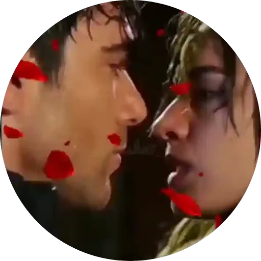 Dos jóvenes besándose, rodeados de pétalas de rosa, en un fondo oscuro. Tienen los ojos cerrados y parecen estar enamorados.